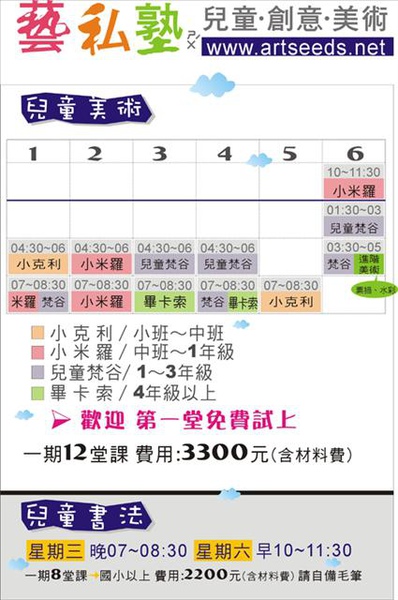 【課務】美術、書法平日班 上課時間表 NEW